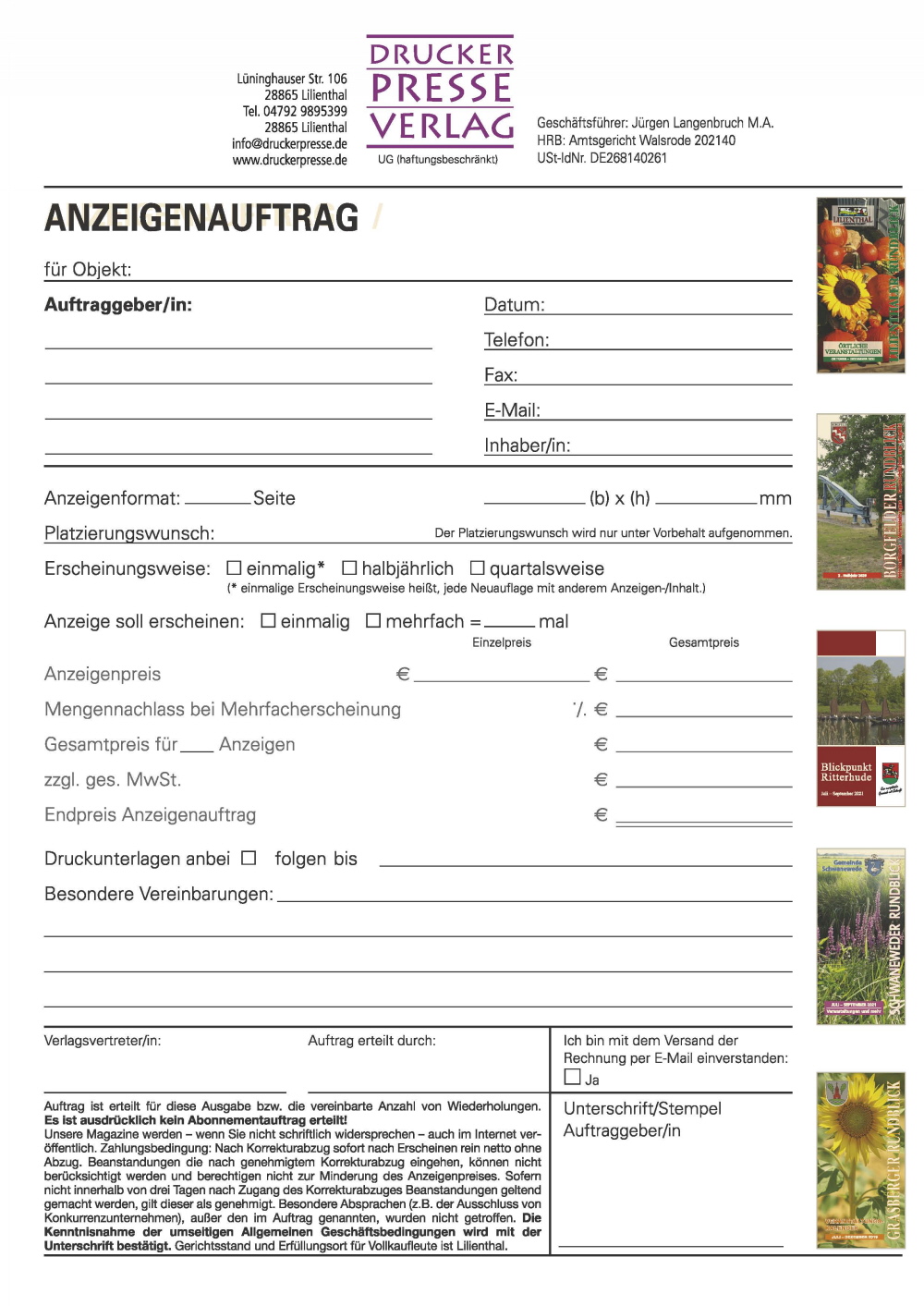 Unter "Mediainformationen" finden Sie unsere derzeitigen Anzeigenpreisliste und Hinweise auf die notwendigen Daten - Sie können sie auch als PDF herunterladen.